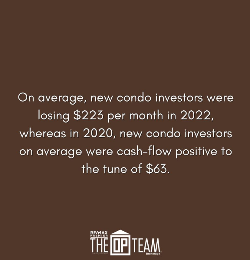 On average, new condo investors were losing $223 per month in 2022, whereas in 2020, new condo investors on average were cash-flow positive to the tune of $63.