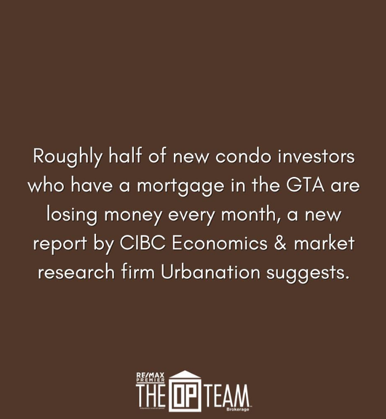 Roughly half of new condo investors who have a mortgage in the GTA are losing money every month, a new report by CIBC Economics & market research from Urbanation suggests.