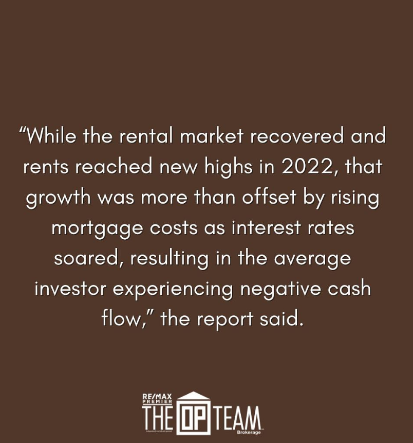 "While the rental market recovered and rents reached new highs in 2022, that growth was more than offset by rising mortgage costs as interest rates soared, resulting in the average investor experiencing negative cash flow," the report said.