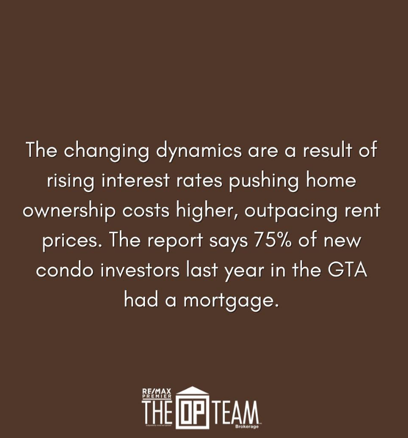 The changing dynamics are a result of rising interest rates pushing home ownership costs higher, outpacing rent prices. The report says 75% of new condo investors last year in the GTA had a mortgage.